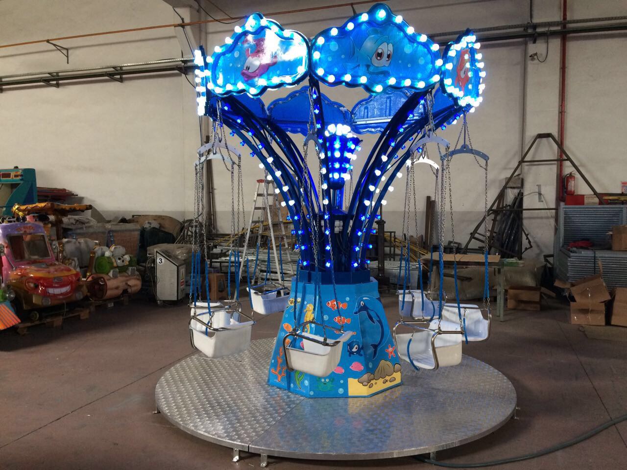 Base Diameter – 5.50 m Height – 3,20 m. Weight – 500 kg. Rotation Speed – 6 – 12 RPM Motive Power – 1,1 kW Lightning – 1,5 kW – on request Motion Power – 220 volt – 50 Hz